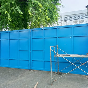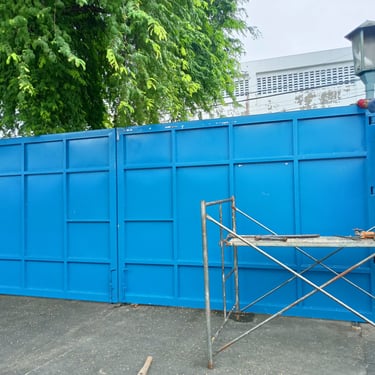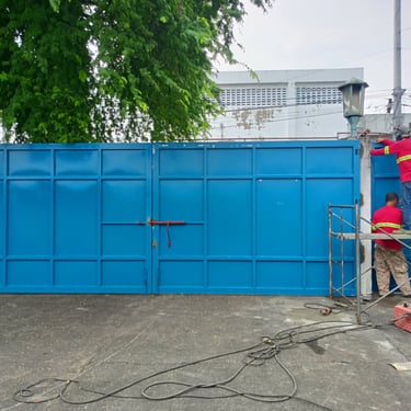 Gate dimensions: 640 cm (L) x 240 cm (H) – swing-type gate. The gate is fabricated using galvanized steel tubular frames (2” x 4” x 2.0 mm) with 2” x 2” x 2.0 mm sub-frames. It is equipped with fabricated heavy-duty hinges and stainless steel cylindrical hinges, and clad with gauge 16 galvanized sheet panels for added strength and durability. The installation was completed in October 2025 at Bagumbayan, Taguig City.