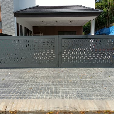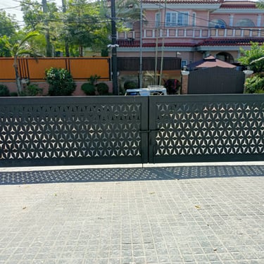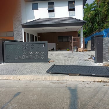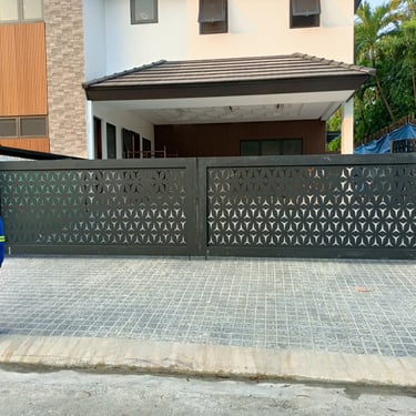 The gate is composed of laser-cut 4mm-thick steel sheet panels, supported by sturdy 2” × 6” steel tubular frames. It is treated with an epoxy primer and finished with a flat black topcoat for durability and a sleek appearance. The system is equipped with 1-1/2” pillow block bearings to ensure smooth and reliable operation. This gate was installed inside Ayala Alabang Village.
