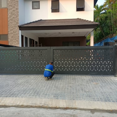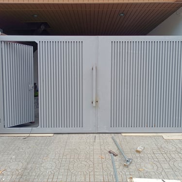 Initially, the gate operated as a bi-fold system with automated mechanisms. However, noticeable traces of rust have appeared in specific areas, and the functionality of the bottom roller has been compromised, leading to increased friction against the guide rails. The following actions have been undertaken: converting the gate into a swing-type configuration, repainting the gate, creating drainage holes in the frames to prevent water accumulation, and realigning the gate for improved performance. Works done inside Beil-Air , Makati