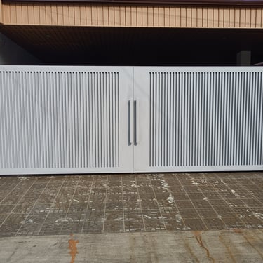 The gate frames are fabricated using high-quality galvanized rectangular steel tubes, combined with a square tubular vertical design for a clean and modern look. The panels are backed with gauge 16 galvanized sheet for added strength and durability. Equipped with heavy-duty hinges to ensure smooth and long-lasting operation. For corrosion protection, we applied epoxy primer paint, ready for the owner’s preferred final topcoat finish.